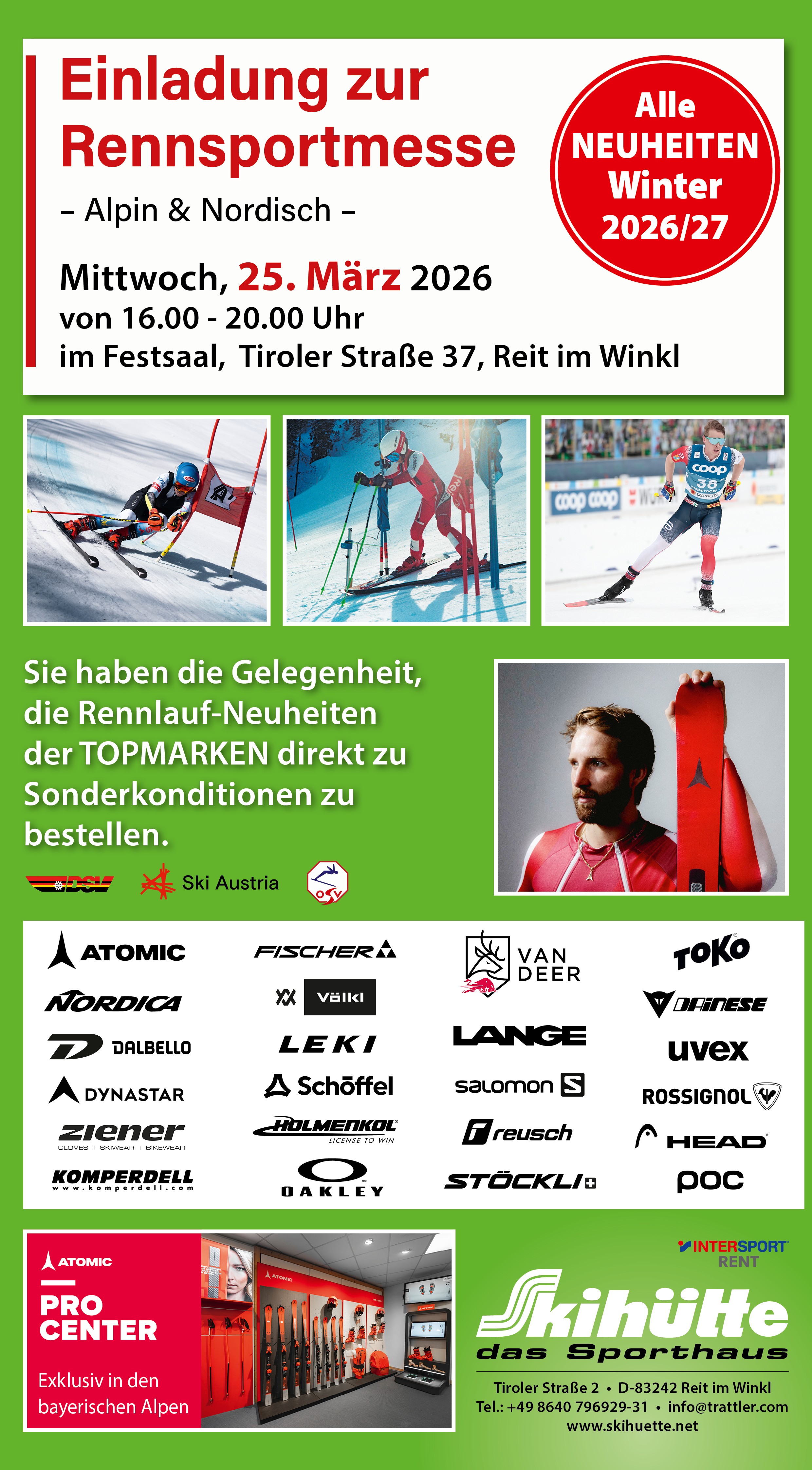 Unsere grossE RENNSPORTMESSE ALPIN UND NORDISCH findet 2026 AM 25. MÄRZ iM FESTSAAL von REIT IM WINKL statt !